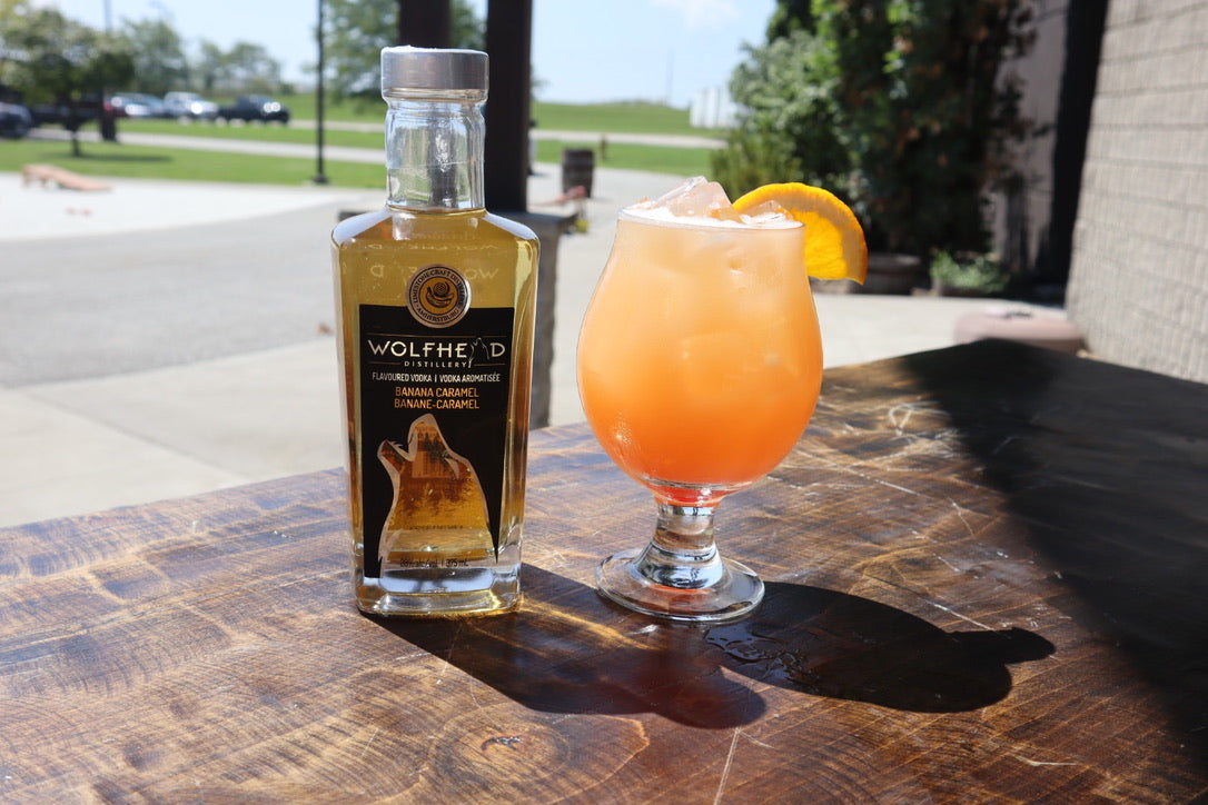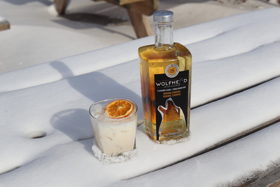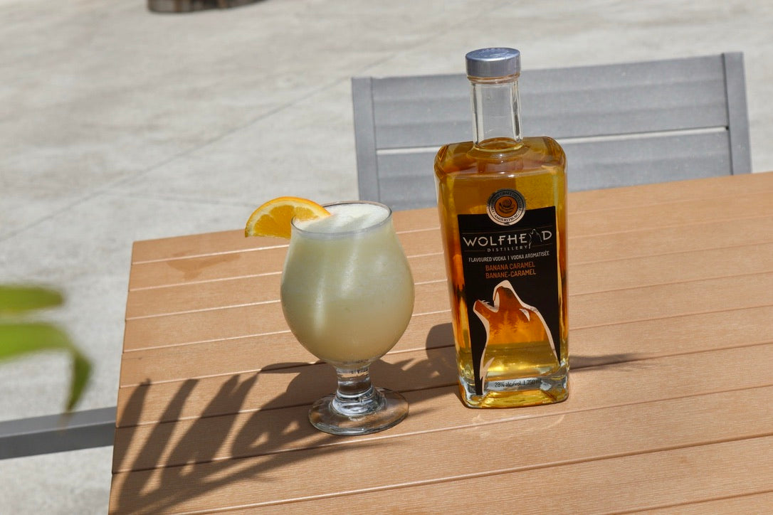 To whip up a Heaven's Door cocktail, grab a shaker. Add 1.5 oz of Wolfhead Banana Caramel Vodka, 0.5 oz of Wolfhead Vanilla Almond Biscotti Cream Liqueur (OR Rum Chata), and 0.25 oz of Orange simple syrup.