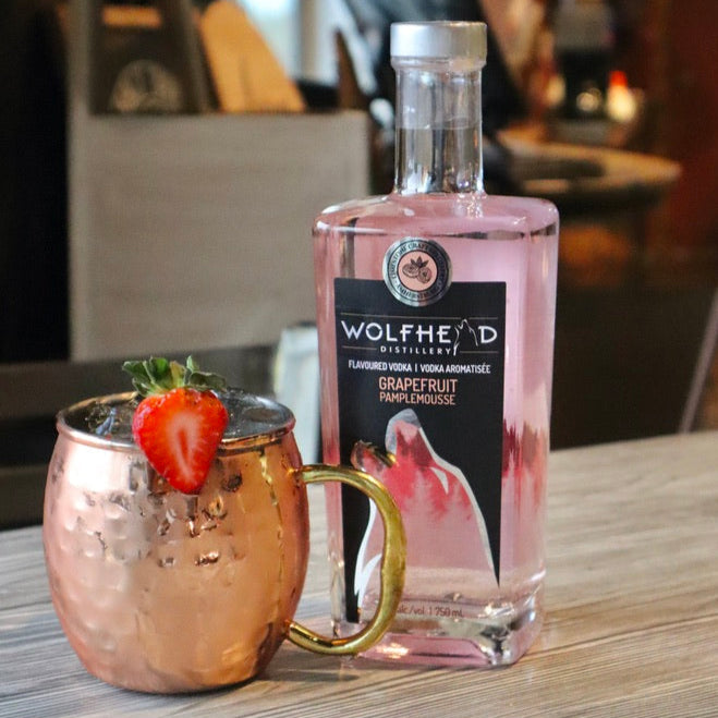 In a copper mug add 2 strawberries, 2 lemons and 2 oz of Grapefruit Vodka and 0.5 oz of Ginger Simple Syrup. Muddle together and add ice. Top with Ginger ale.