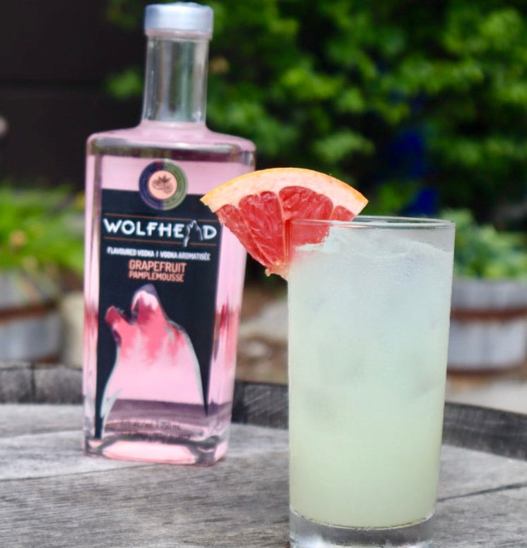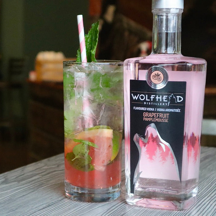 Crafting a Wolfhead Cosmo is a breeze! Start by muddling together a grapefruit wedge, lime wedge, and a splash of orange simple syrup. Add 2 oz of Wolfhead Grapefruit Vodka and 2 oz of cranberry juice to the mix.